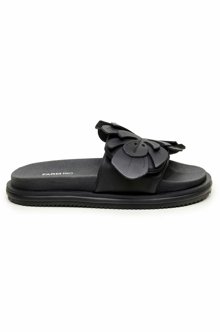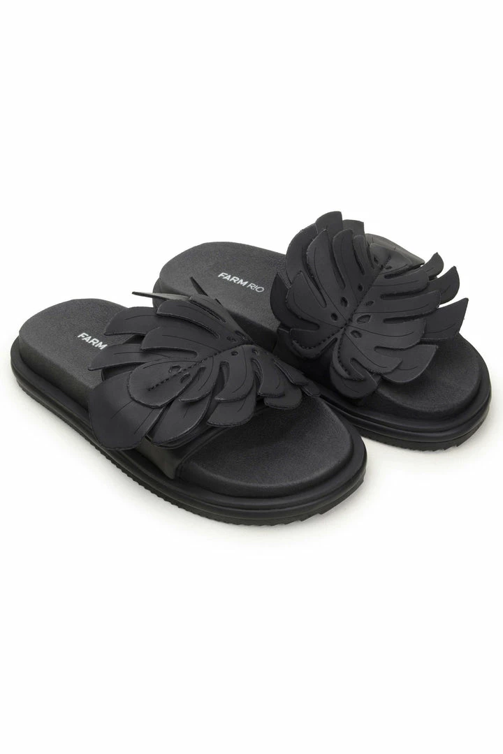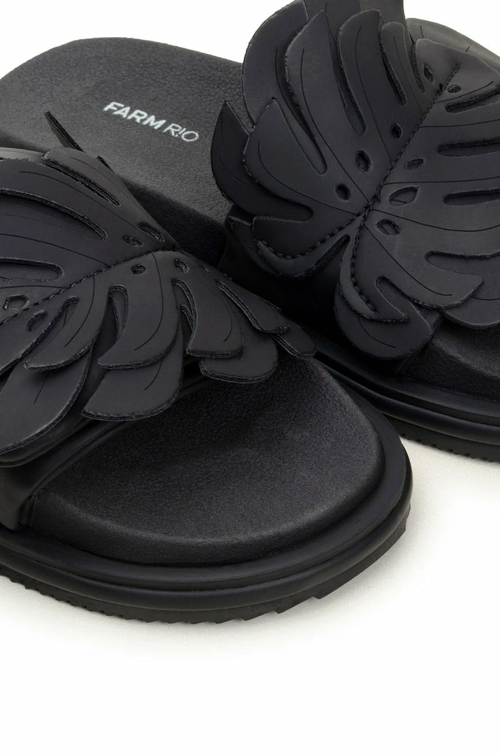 Walk in Happiness! The Black Monstera Anatomic Slide Sandal features a monstera-shaped vegan leather strap and a rubber sole. Your FARM Rio Shoes match pretty much everything you have in your timeless wardrobe, from dresses to jumpsuits to pants (and all in between!).