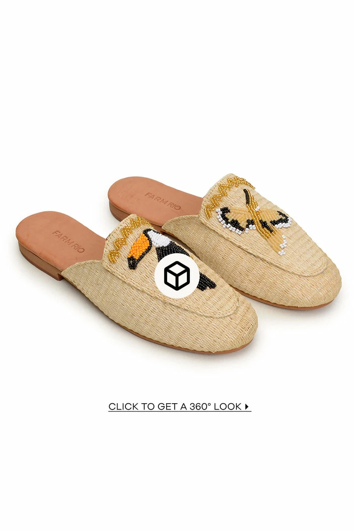 Walk in Happiness! The Toucan Raffia Mule features a straw upper with embroidered beads and a rubber sole with vegan leather. Your FARM Rio Shoes match pretty much everything you have in your timeless wardrobe, from dresses to jumpsuits to pants (and all in between!).