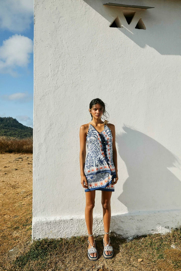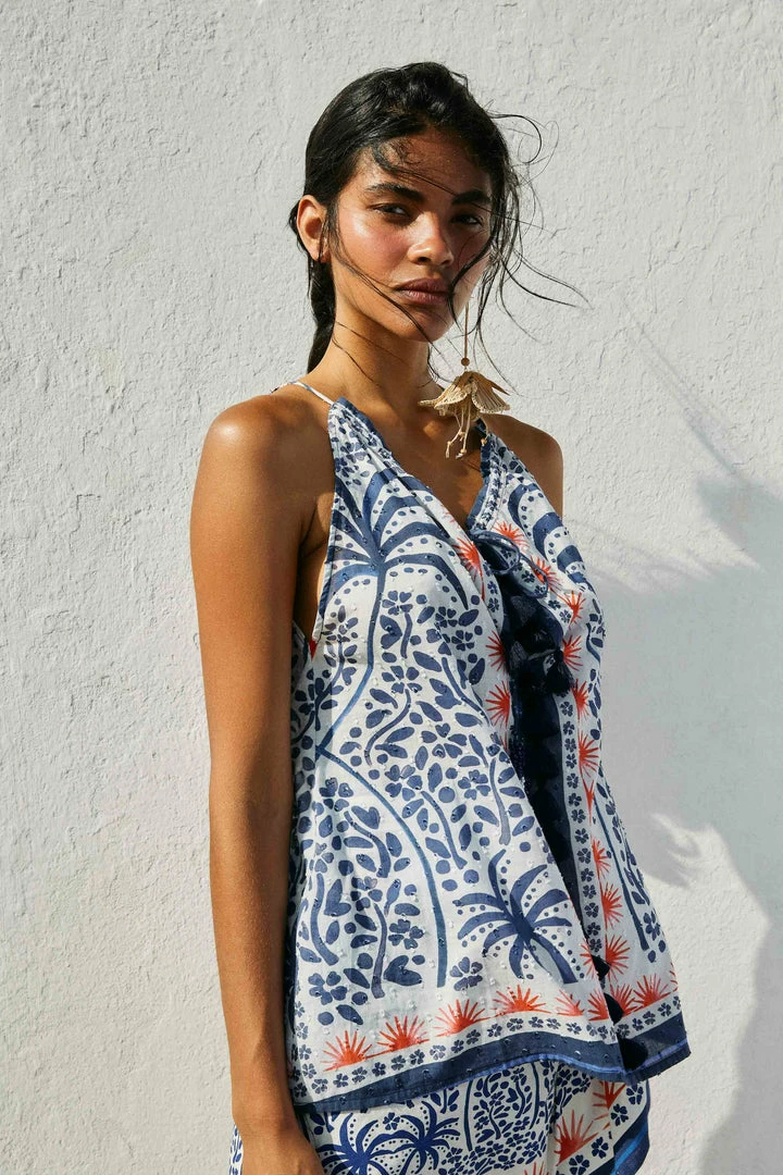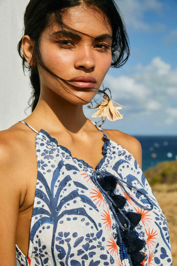 You’ll dress in happiness on repeat this Summer! The Afternoon Breeze Blouse lands here to add some tropical nature to your sunny looks. It features a standout neckline with ties and beaded tassels, some bold tassels at the front, and a print that delivers joy. It matches your printed and solid bottoms, but with the Afternoon Breeze Mini Skirt, it’ll be love at first sight <3 So invite your fresh FARM Rio Shoes to complete your lovely combo!
