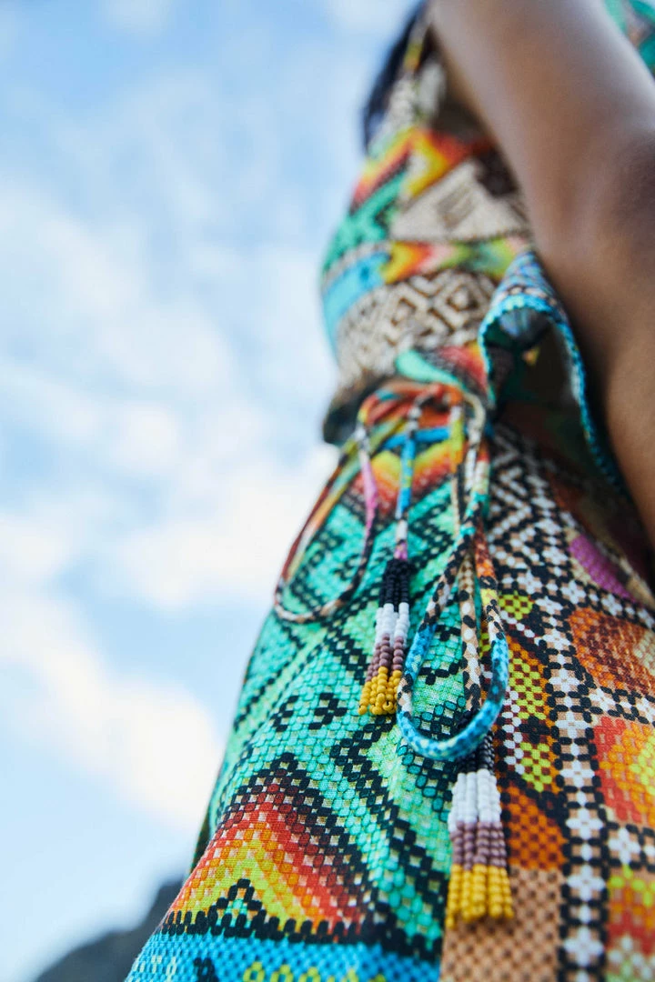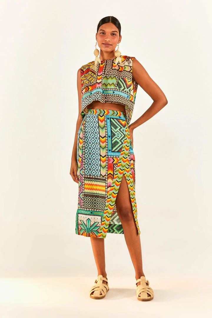A delicate way to dress in happiness: the Banana Scarves Slit Midi Skirt has a standout silhouette with a front slit and beaded tassels, and a print with all the elements to make a WOW impression. It pairs well with your fresh tops, but the Banana Scarves Crop Top is the perfect match!