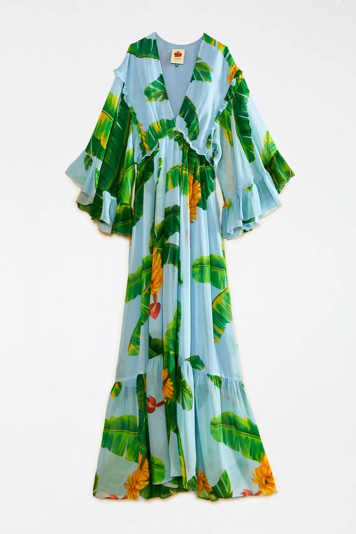 Ready to taste this delicious tropical fave? The Blue Fresh Bananas Maxi Dress brings one of our must-have prints full of flavor! It features a relaxed fit with a head-turning neckline, long sleeves, ruffles, and a skirt that follows your sunny moves. Pair it with fresh FARM Rio sandals and mules for the boldest look <3