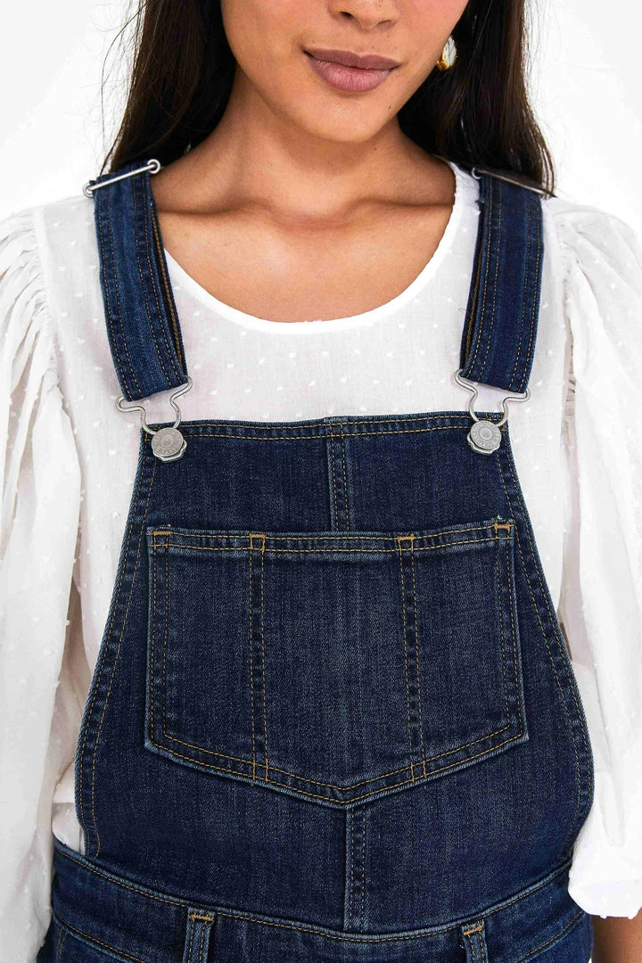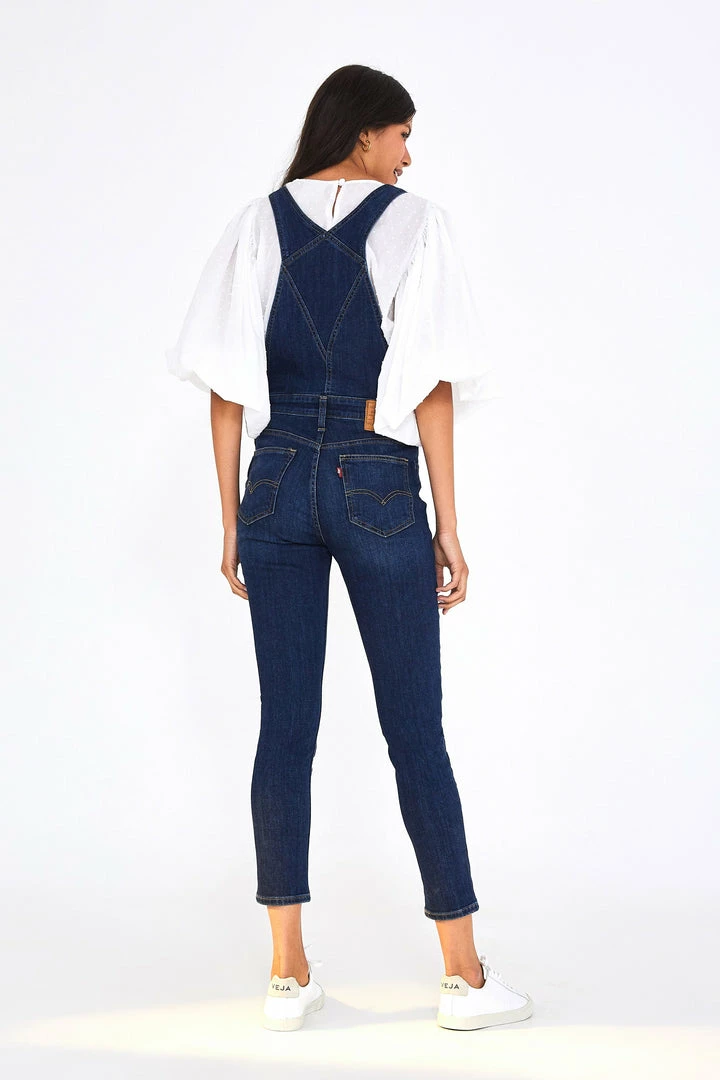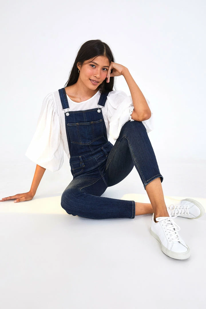 An updated version of the classic overall. Skinny fit legs in medium wash denim. Front chest pocket with five pocket design.