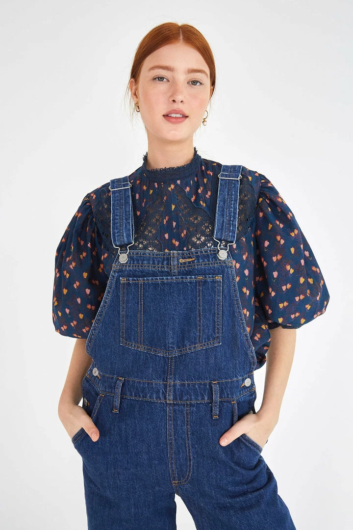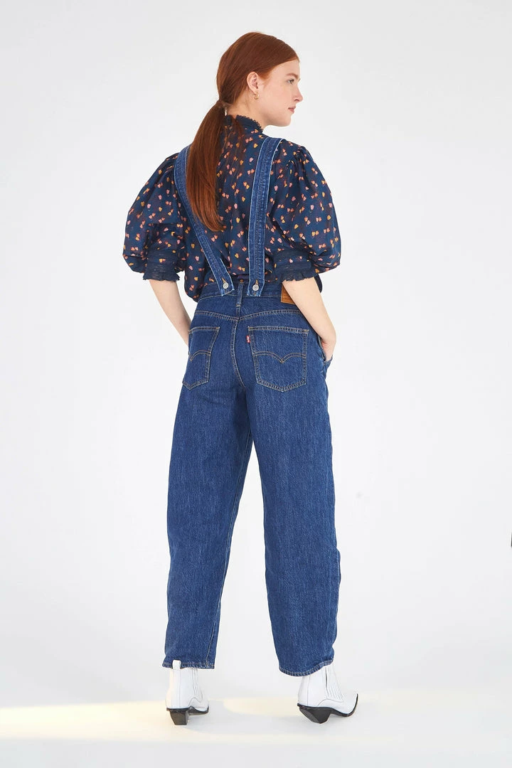Denim overalls with baggy fit legs in medium wash. Front chest pocket with four pocket design.