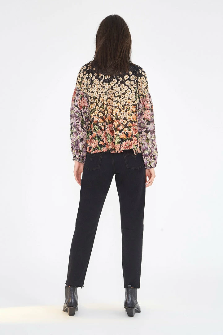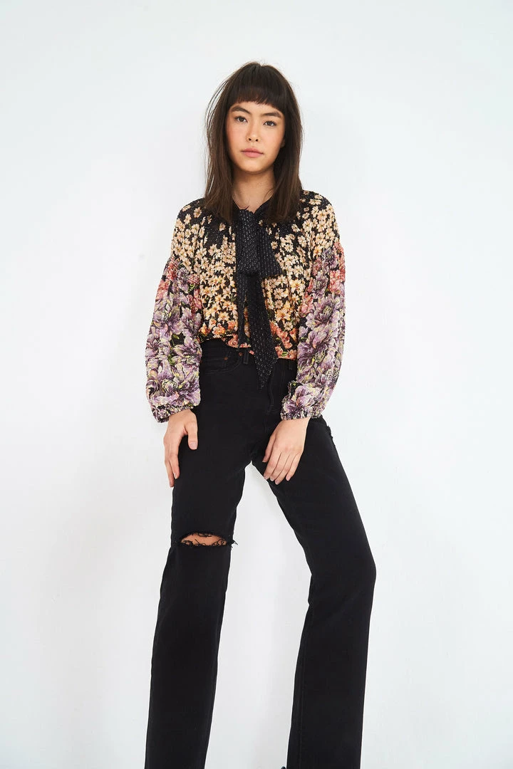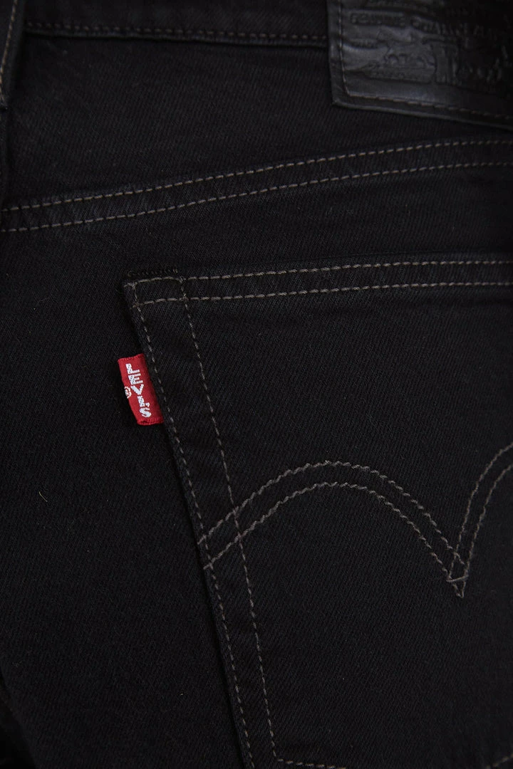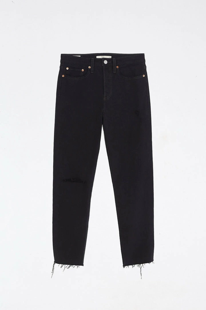 Straight leg jeans in jet black wash. Distressed detailing. Raw hem. Zip fly with button closure. Five pocket design.