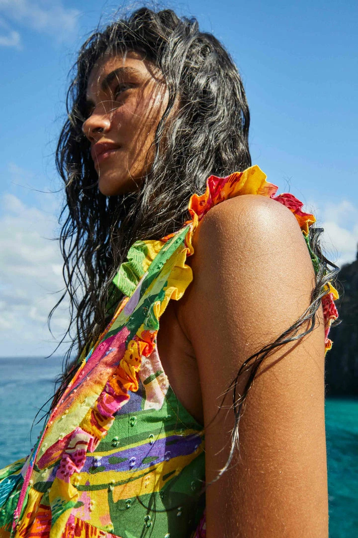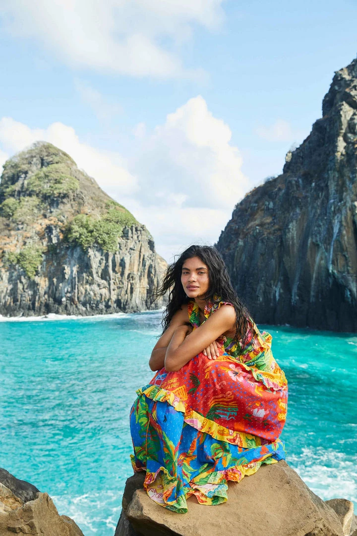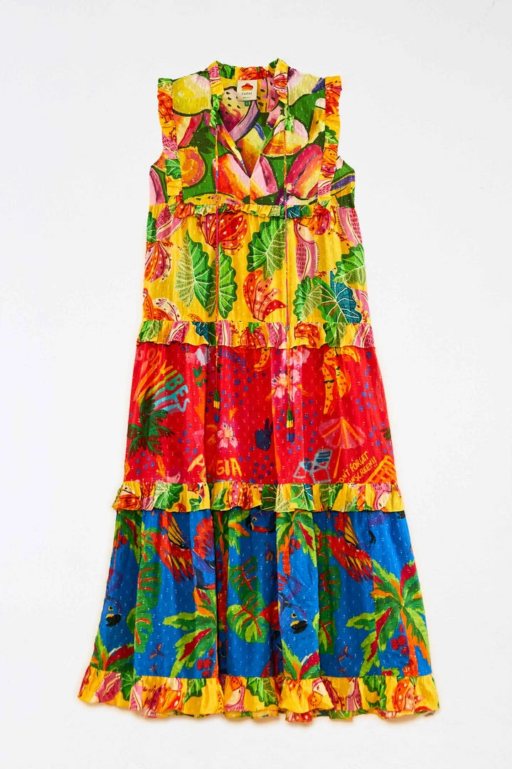 Welcome to our tropical-prints paradise! The Mixed Prints Tiered Maxi Dress brings some of our most-loved motifs to be your solar companion. It features a standout neckline with ties and beaded tassels, cute ruffles all around, and a flowy skirt to follow your bold moves. What if you invite your fave FARM Rio Shoes to complete your look? That’s a WOW decision, baby!