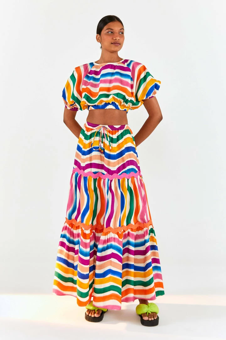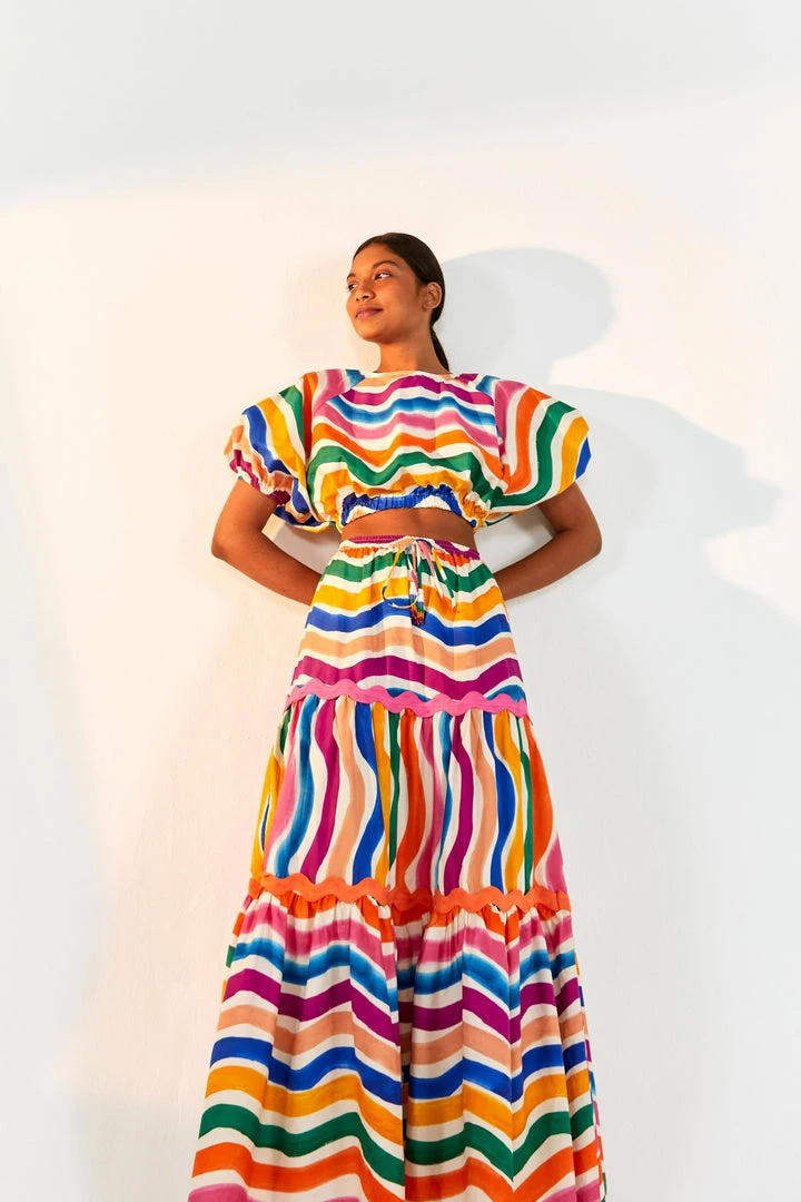 A joyful way to color up your looks! The Dancing Stripes Maxi Skirt is a basic-not-basic fave that matches your fresh tops from t-shirts to blouses (and everything in between!). Moreover, it’s the perfect buddy for the Dancing Stripes Puff Sleeve Crop Top. Isn’t it amazing to dress in happiness on repeat?