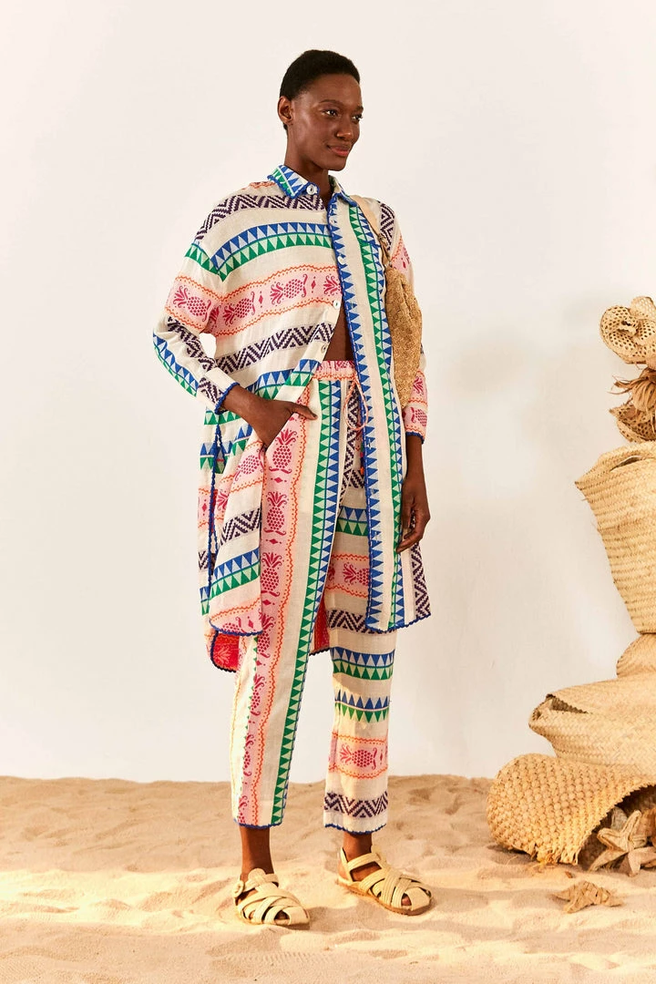 Your season just got an artisanal-yet-cool vibe! The Multicolored Pineapple Jacquard Pants are something to wear on repeat to enjoy daily and night plans. It has a comfy fit and a standout elastic waistline with ties and beaded tassels. Did you notice the crochet detailing? Really, a must! And you can create a WOW set matching it with the Multicolored Pineapple Jacquard Shirtdress <3