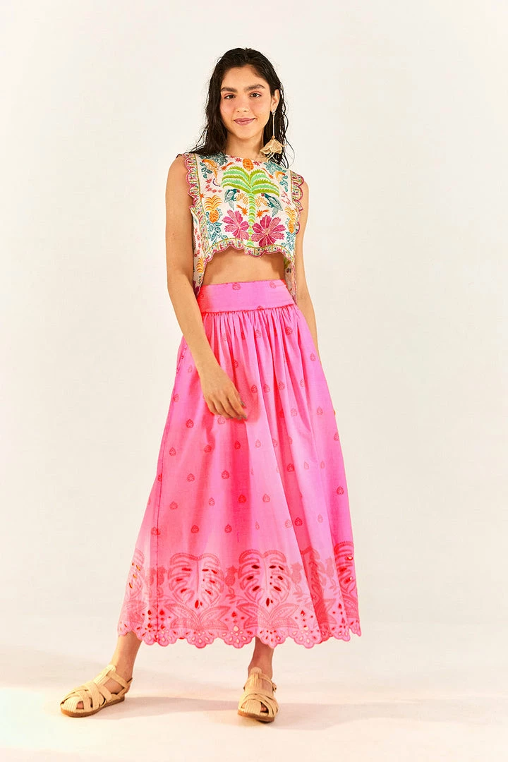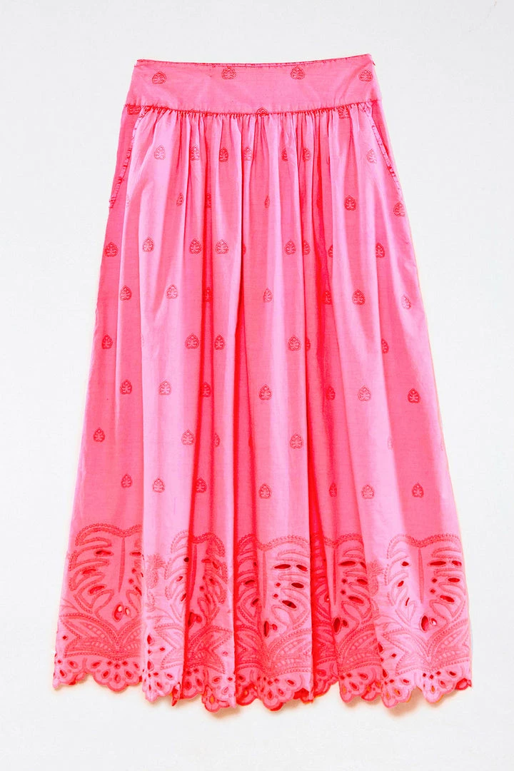 A precious fave to be in your wardrobe, whatever the season! The Neon Pink Richelieu Maxi Skirt comes to match all your bold tops (printed or not, you name it!). It has a cozy silhouette, side pockets, and the artisanal work is a jaw-dropping way to dress in happiness year-round. Bring your sunny shoes and accessories to complete your joyful combo <3