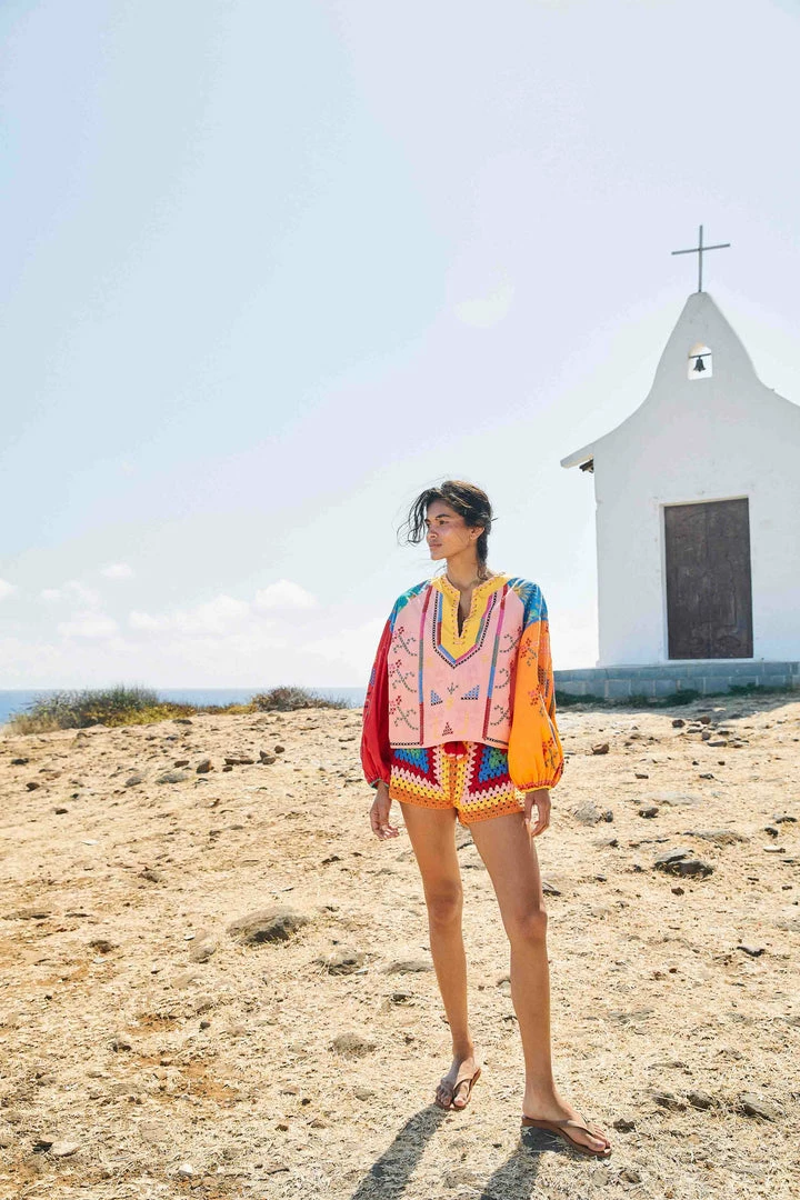 Meet the fave that will leave people speechless: the Color Block Embroidered Blouse is here to be the boldest companion to your standout bottoms! It features a detailed, colorful embroidered work all around its easy, relaxed silhouette. The unique neckline is also something to drop some jaws everywhere. Your new fave blouse matches everything from crochet shorts to denim, and you can choose styles in the same palette to create a WOW look.