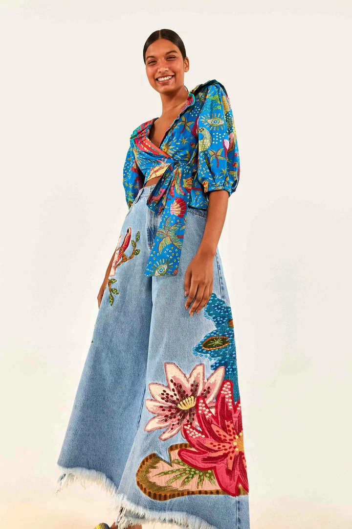 These embroidered denim pants from FARM RIO are stunning! The design is so vibrant and eye-catching. They fit true to size and are perfect for both casual outings and more dressed-up occasions. A definite must-have!