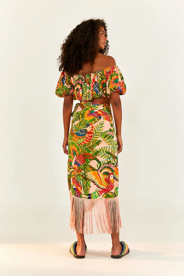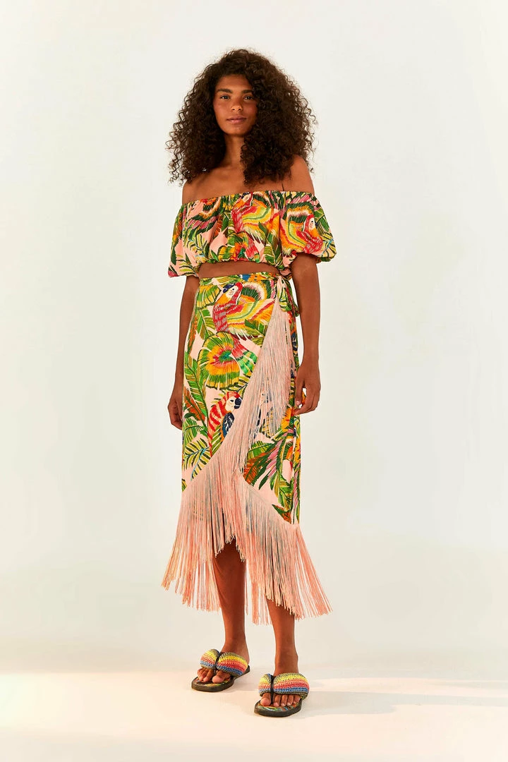 What a joyful way to fly higher this season! The Macaw Leaves Off Shoulder Crop Top features the coziest silhuoette you can find out there with a tropical print. Your new fave top matches the Macaw Leaves Fringe Wrap Skirt, and you can also choose bottoms in the same palette to create WOW looks.