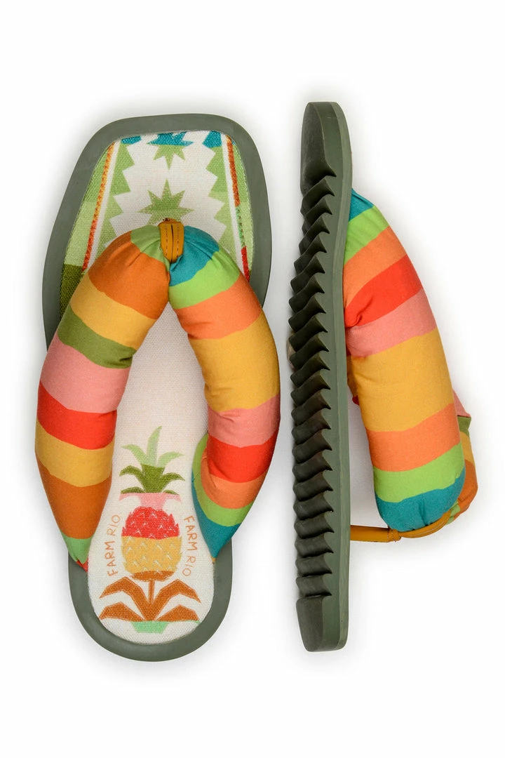 Walk in Happiness! The Pineapple Puffy Flip Flop features a puffy cotton upper with foam inside and a rubber sole. Your FARM Rio Shoes match pretty much everything you have in your timeless wardrobe, from dresses to jumpsuits to pants (and all in between!).