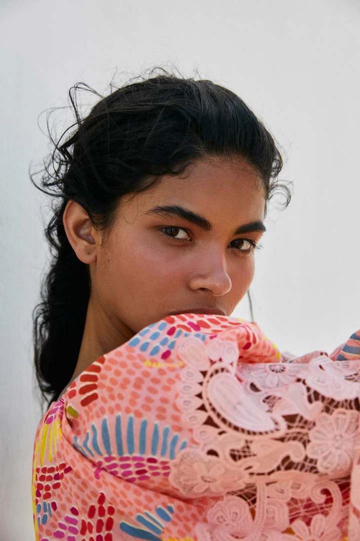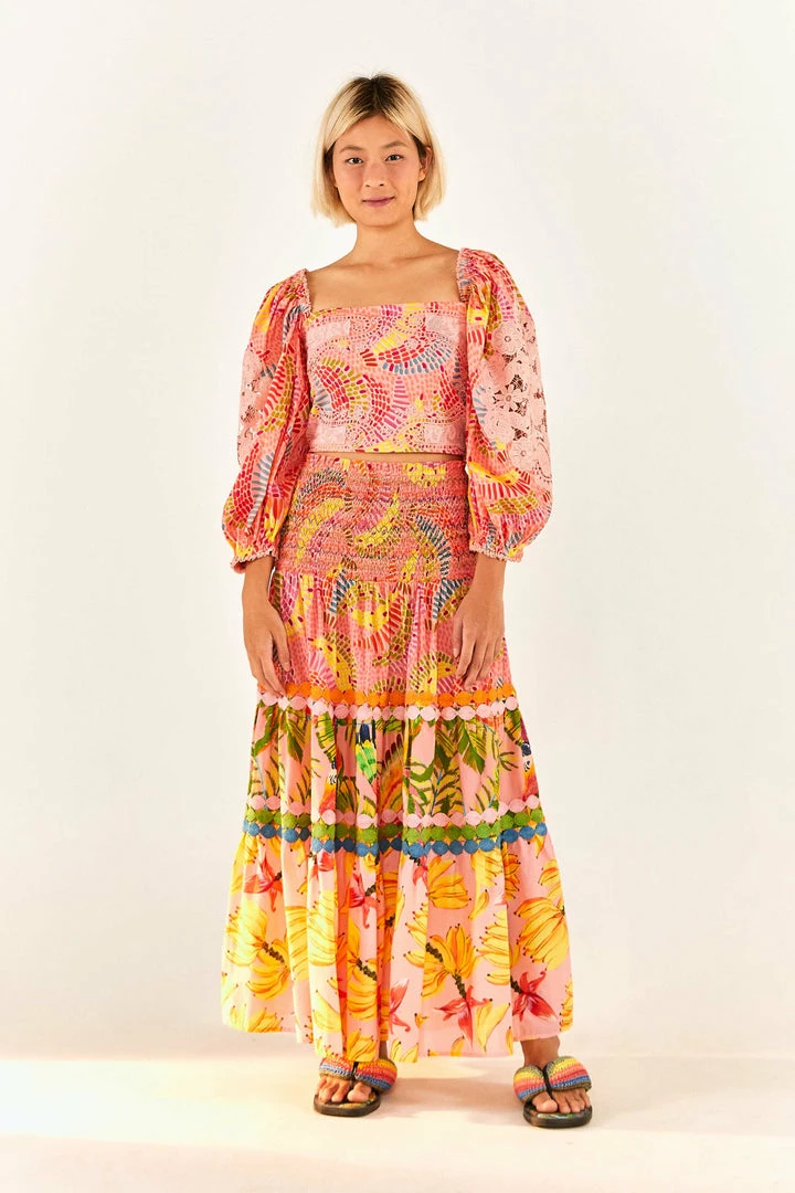 What a delicious Summer it will be! The Pink Dotted Bananas Blouse is a fresh piece to be your companion from the city to the beach (and all places in between!). It has a cozy fit, WOW lace detailing, and a tropical print full of flavor. We can’t help but mention that the Mixed Pink Prints Midi Skirt it’s the perfect match for your new fave top <3