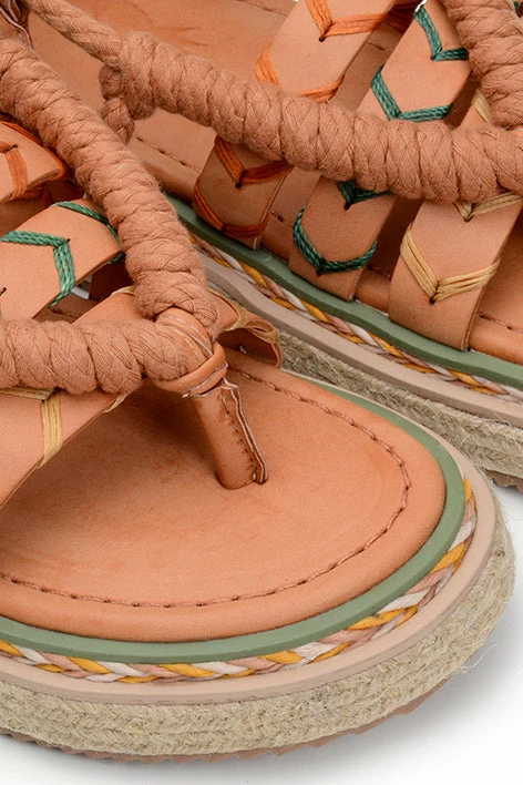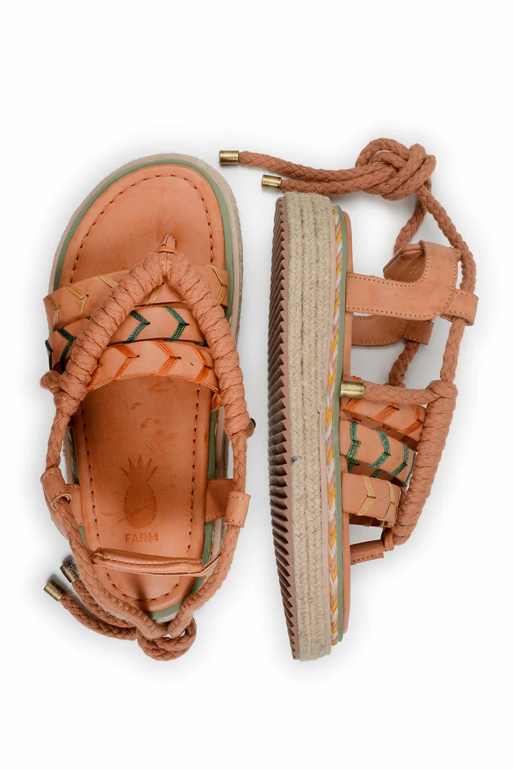 Walk in Happiness! The Sand Rope Tie Flatform Sandal features a vegan leather upper, cotton ropes with wood tassels, and a rubber sole with cotton ropes, jute, and vegan leather. Your FARM Rio Shoes match pretty much everything you have in your timeless wardrobe, from dresses to jumpsuits to pants (and all in between!).
