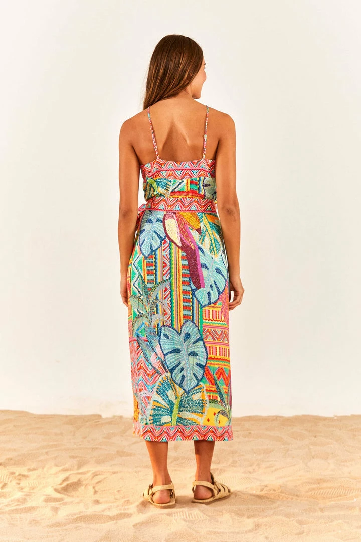 Your season just got way more colorful! The Summer Tapestry Halter Neck Midi Dress brings our carioca spirit through sun-filled elements in a fave you won’t get enough of. It features a cozy fit with a halter neck and a wrap skirt to go with your bold flow (have you noticed the beaded tassels? WOW!). So throw your fresh FARM Rio sandals on and take over the solar world!
