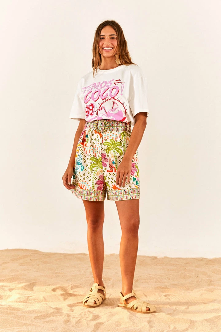 Sometimes you can stay in your comfort zone! The White Temos Coco T-Shirt is the new definition of a comfy fave: both the shape and the tropical print will walk you through joyful plans. Invite all your bottoms to have fun, from pants to shorts to overalls (and every cool style in between!).